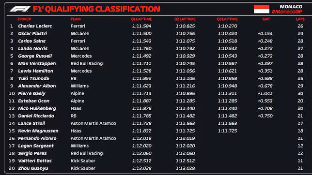 Leclerc, de 26 años, firmó su vigésima cuarta 'pole' en la F1 -la primera del año y la tercera en Mónaco- al cubrir, en la tercera y decisiva ronda de la calificación (Q3), los 3.337 metros del circuito más corto, más estrecho y más lento del calendario en un minuto, 10 segundos y 270 milésimas. Exactamente 154 menos que el australiano Oscar Piastri (McLaren) -que saldrá segundo- y con 248 de ventaja sobre el español Carlos Sainz (Ferrari), tercero.